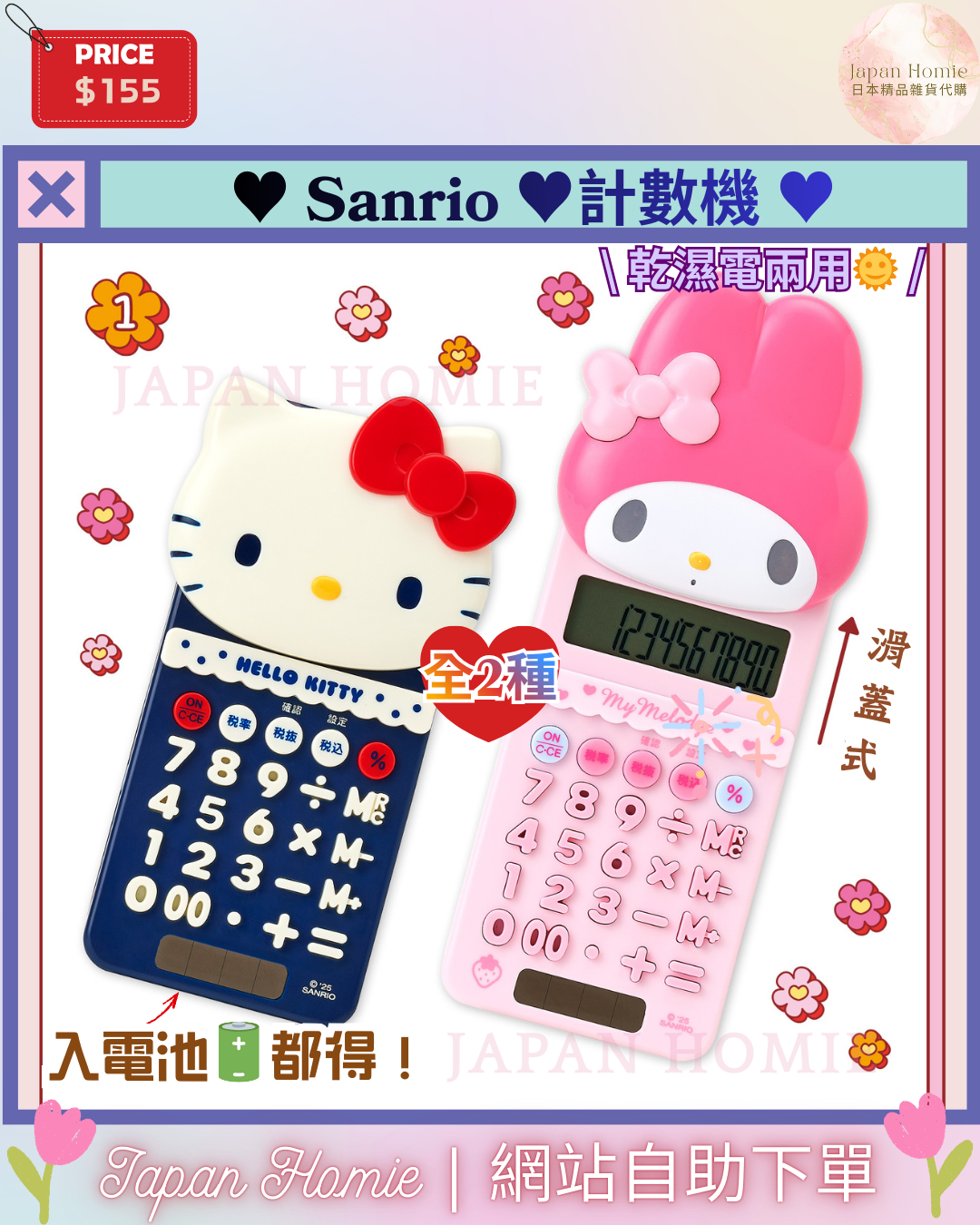 到貨期:約3星期到港 **數量有限,如遇缺貨,會安排全數退款** 📍更多Sanrio精品: www.japanhomie.store/c/Sanrio貨品 📍更多Kitty精品: www.japanhomie.store/c/⭐Sanrio角色分類⭐/Kitty 📍更多Melody精品: www.japanhomie.store/c/⭐Sanrio角色分類⭐/Melody 🎀✨ 計數都可以超可愛! 你有冇諗過,平時上堂/返工/屋企做開支記錄,都可以用一部超萌嘅 HELLO KITTY / My Melody 系列滑蓋計算器?📚🧮 ☀️ 太陽能 + 電池雙供電,唔怕光線唔夠都唔好用 👍 — 確保你隨時隨地都能計數/記帳/Budget。 🔒 滑蓋設計 + 可愛顔值,比普通計算機更有風格,放喺書桌/袋袋/返學袋都唔怕突兀,仲會成為焦點 ✨ 🐱 小巧便攜 最啱送禮🎁 或自己用 ~